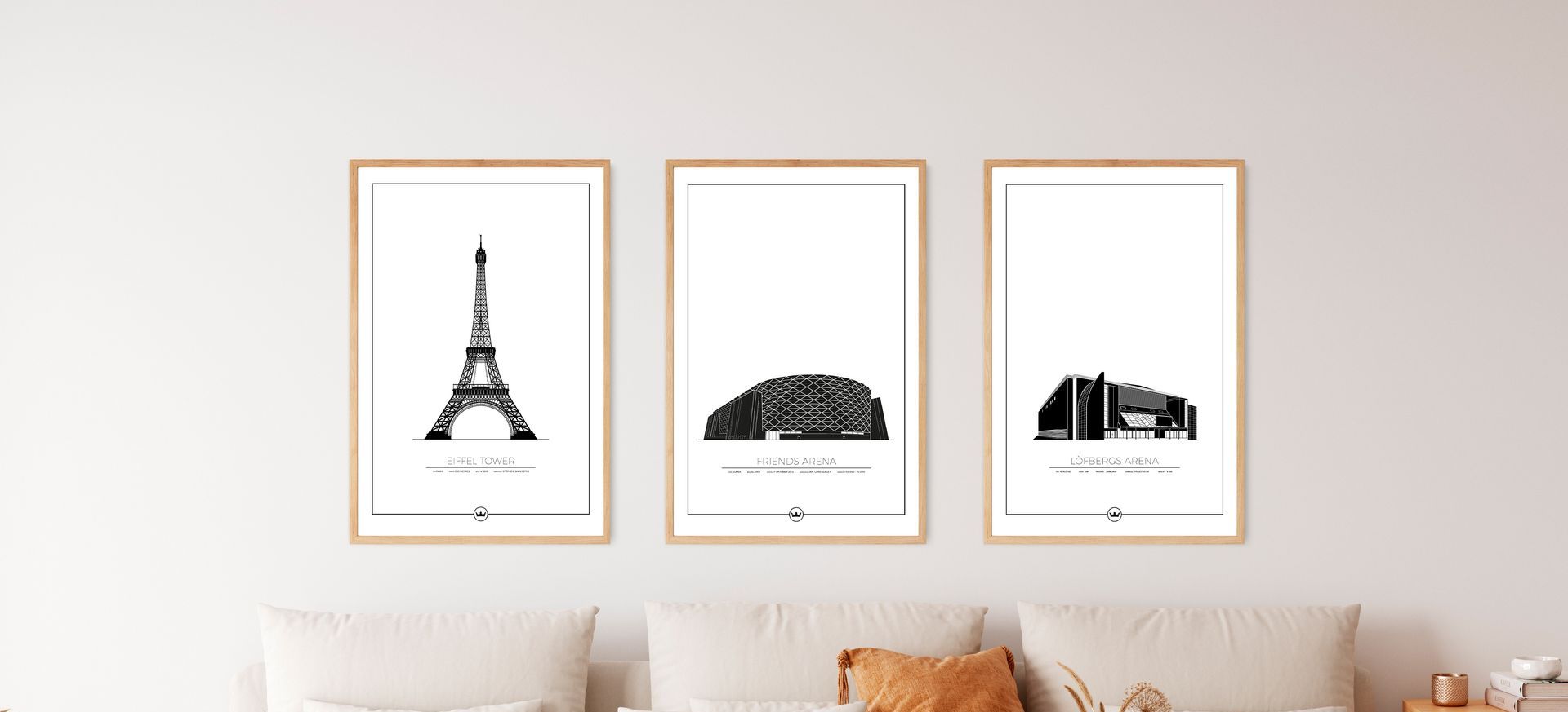 Vi skapar posters och brickor med grafiska motiv av byggnader, städer och platser som betyder något – från Friends Arena till Brooklyn Bridge och din egen hemstad. Stilren nordisk form, hög kvalitet och en tydlig tanke: att låta dina väggar berätta din historia.